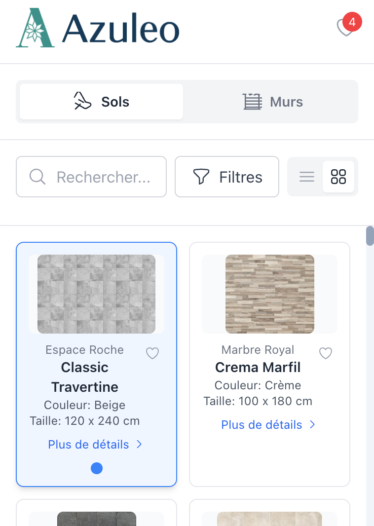 Azuleo est un simulateur de carrelage en ligne qui permet aux particuliers et aux professionnels de visualiser différents modèles de carreaux directement sur des pièces virtuelles. Les entreprises peuvent y intégrer leurs propres collections, leur logo et leur identité visuelle pour offrir une expérience unique à leurs clients.